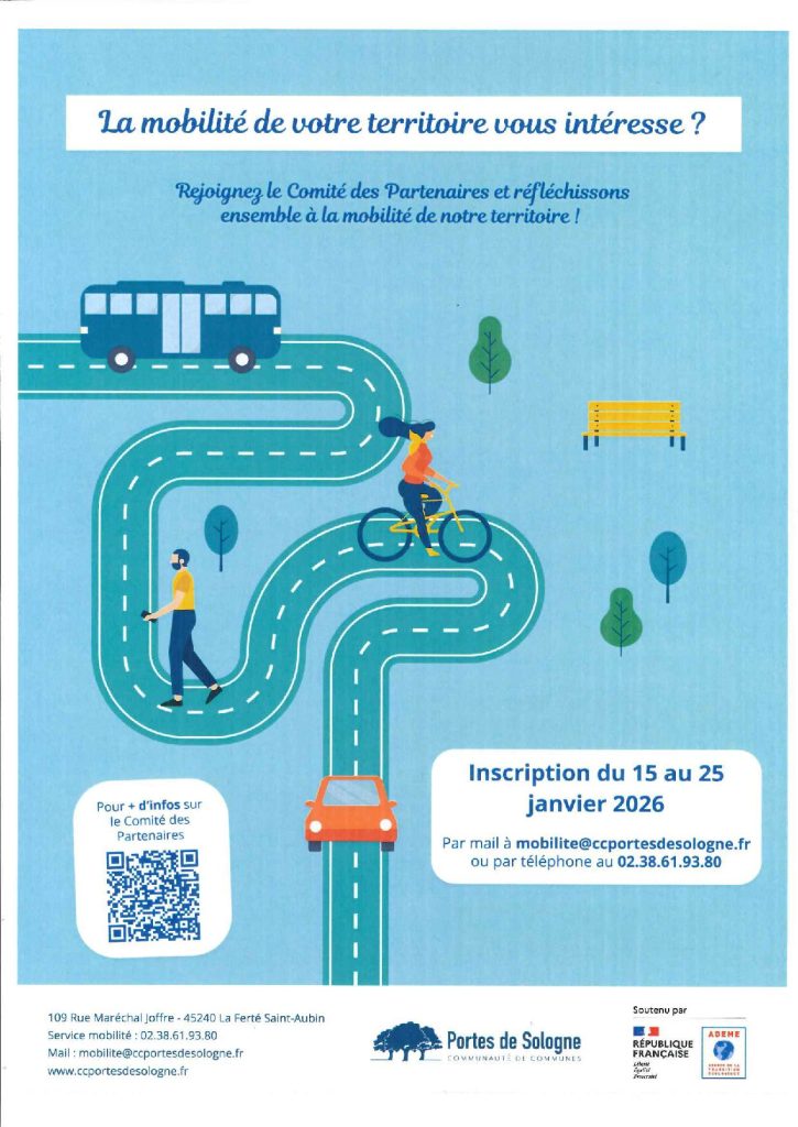 Dans le cadre de l’élaboration du Plan de Mobilité Simplifié de la Communauté de Communes des Portes de Sologne, nous devons former un Comité des Partenaires constitué d’élus, de partenaires institutionnels et d’habitants, dont l’objectif est d’échanger sur la mobilité de notre territoire.
