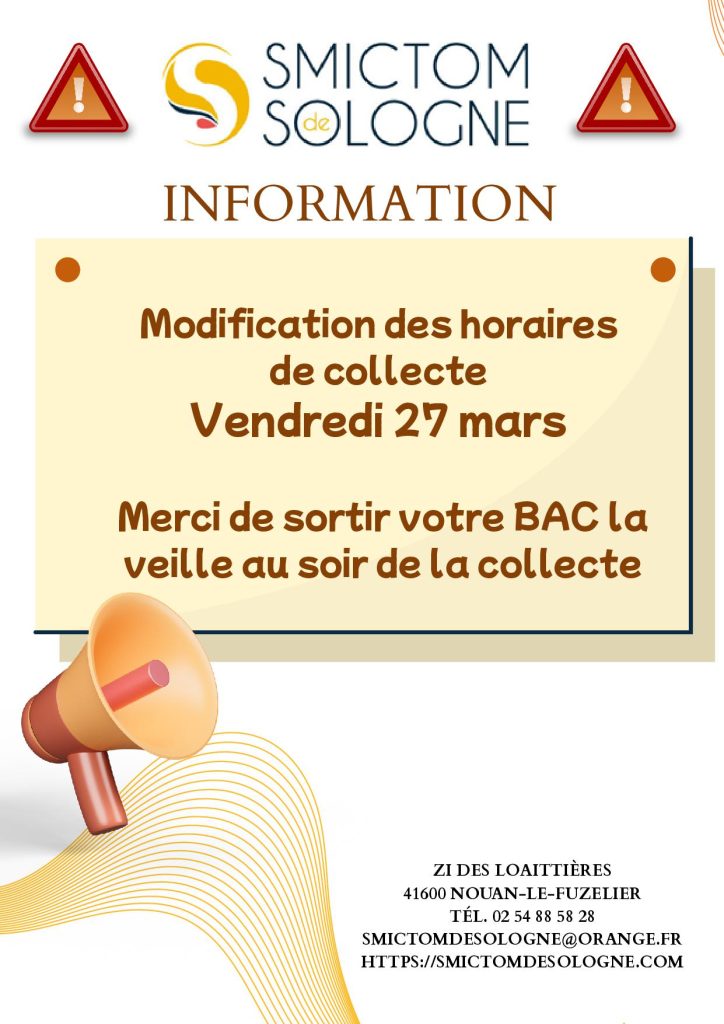 SMICTOM Modification des horaires de collecte Vendredi 27 mars