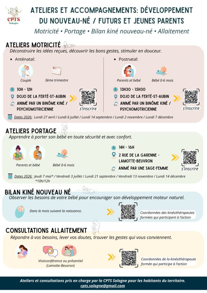 La Communauté Professionnelle Territoriale de Santé (CPTS) de Sologne organise à destination des futurs et jeunes parents des ateliers (motricité, portage, bilan kiné du nouveau-né et consultations allaitement).